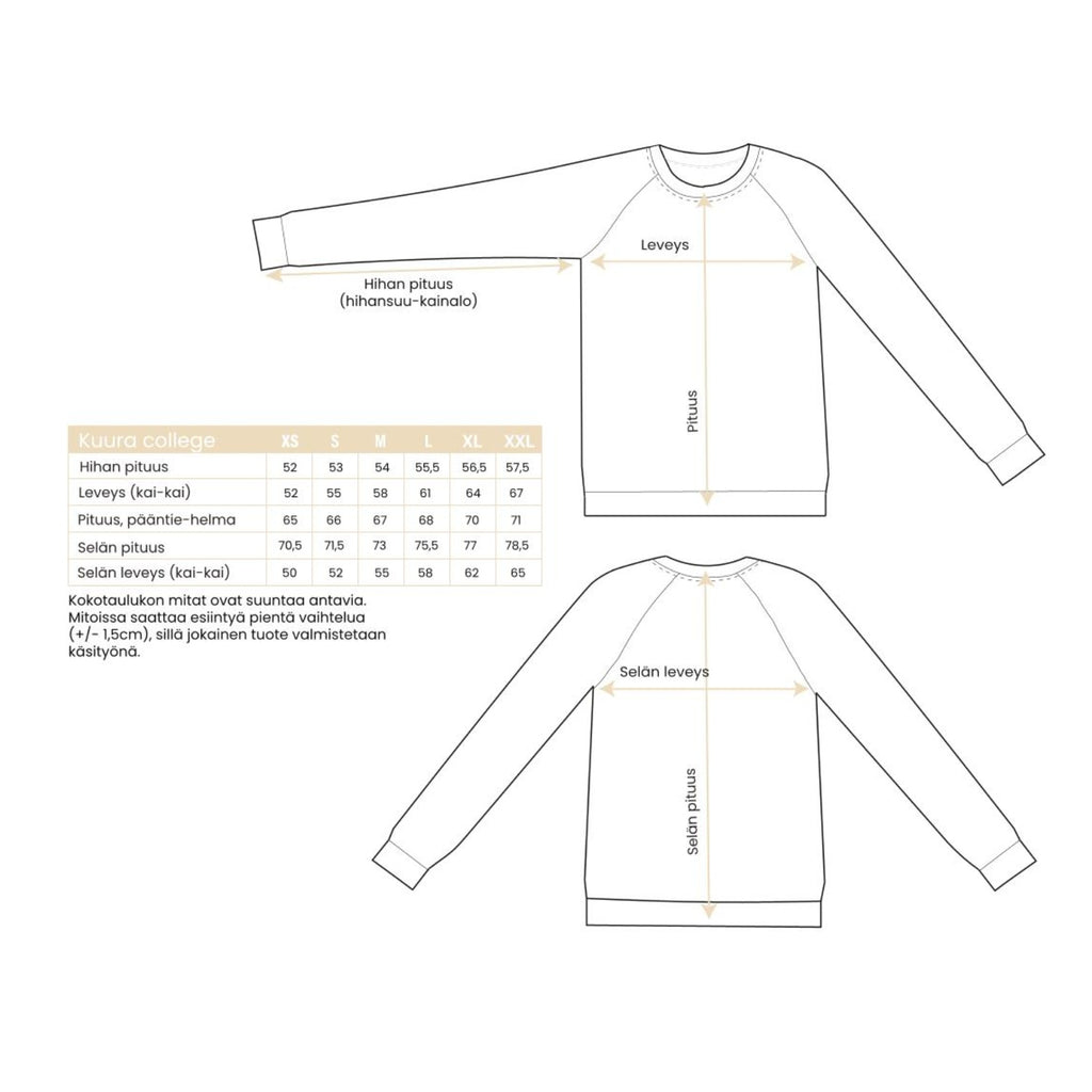 Klassinen, monessa toimiva collegepaita, jonka mitoitus sopii niin miehille kuin naisille. Materiaali laadukasta Suomessa neulottua 100% luomupuuvillacollegeneulosta. Paidassa on suora, rento malli ja paidan raglanhihat parantavat istuvuutta. Riittävän pitkä helma ja hihat, joissa on leveät resorit. Sopivan kireän, mutta joustavan helmaresorin ansiosta paita on hyvin muunneltavissa ja istuu täydellisesti haluammallasi tavalla.