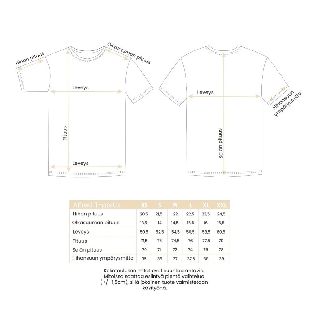 Koko on unisex ja istuu hyvin sekä miehille että naisille. Mitoitus vastaa kokomerkintää, joten voit huoletta tilata normaalin kokosi. Jos haluat oversize vaikutelman, valitse kokoa isompi.