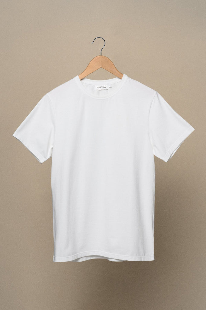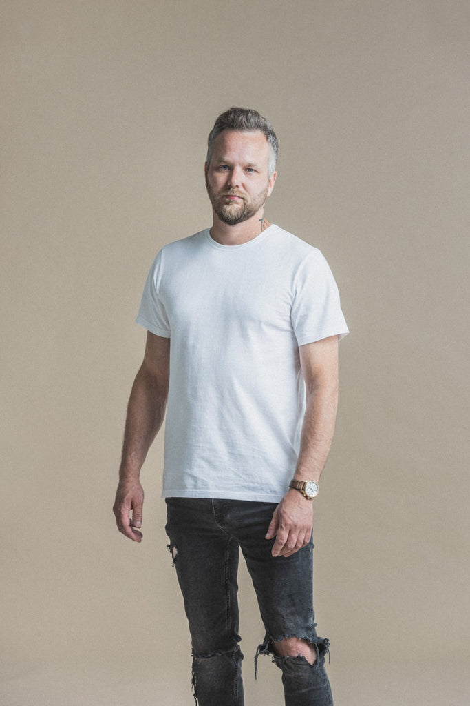 Jotta tämä oli mahdollista, valkoinen ALFRED T-paita valmistettiin erilaisesta kankaasta kuin sitä vastaava musta. Paidan neuleen paksuus on 190g/m2, mikä tekee materiaalista ryhdikkään, mukavan paksun ja läpinäkymättömän.