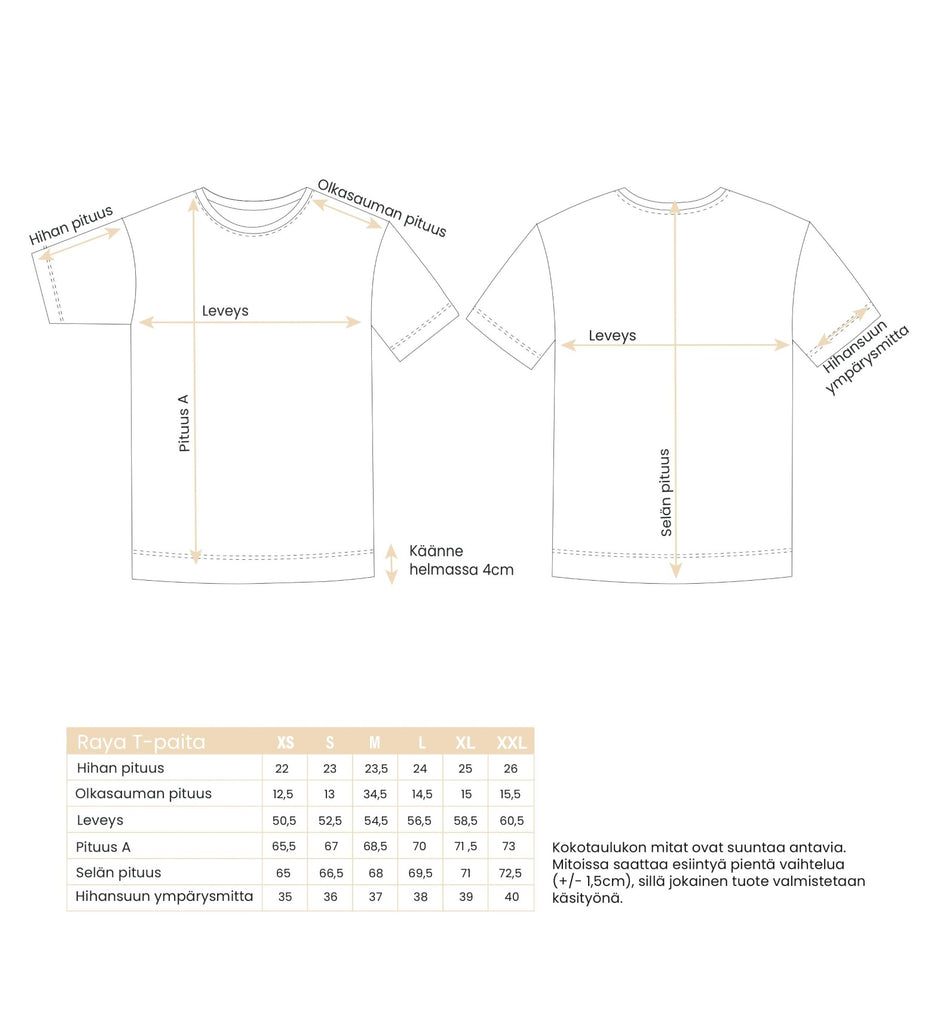 Paidan mittataulukon löydät tuotteen kuvista. Mitat ovat edestä ja takaa. Otathan mitatessa huomioon, että kokotaulukoiden nuolet ovat juuri niissä kohdin mistä mitta kuuluu ottaa. Kokotaulukon mitat ovat suuntaa antavia. Mitoissa saattaa esiintyä pientä vaihtelua (+/- 1,5cm), sillä jokainen tuote valmistetaan käsityönä.